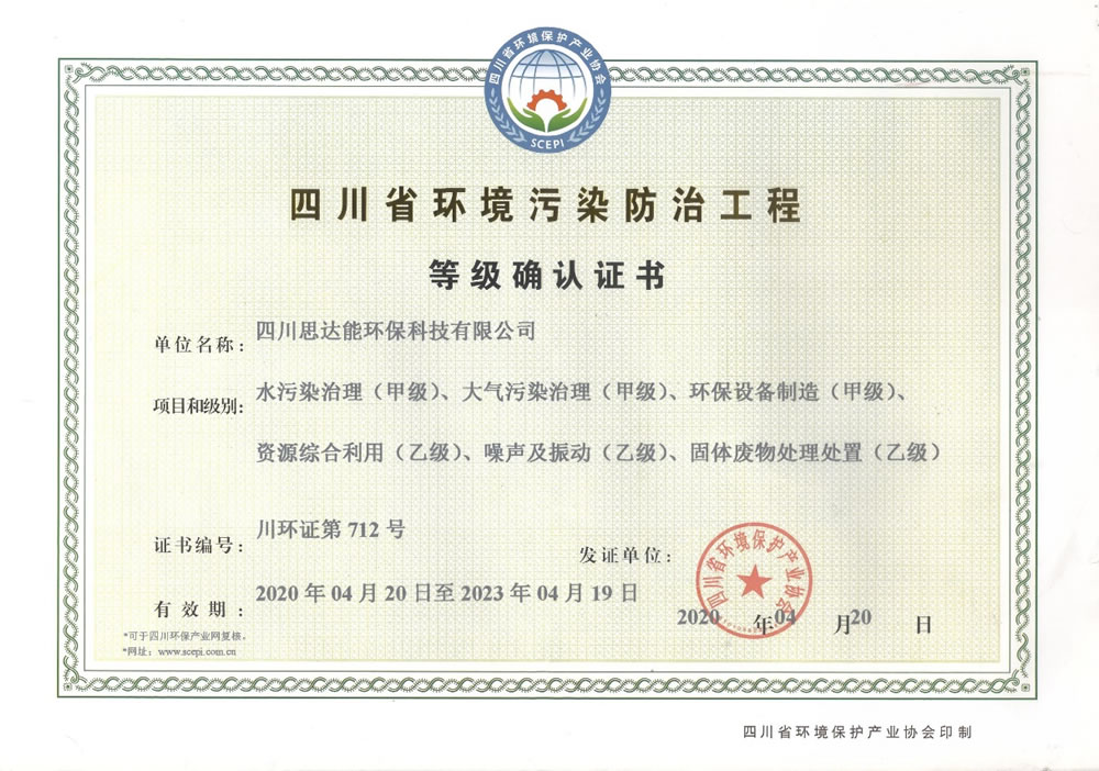 The company has two general contracting qualifications: Grade III General Contracting of municipal public works construction and grade III professional contracting of environmental protection works. Three class A qualifications: air pollution control, water pollution control and environmental protection equipment manufacturing. Three class B qualifications: comprehensive utilization of resources, noise and vibration, and solid waste treatment and disposal. The company has the evaluation certificate of the operation service capacity of pollution control facilities, "industrial waste gas treatment class II", "industrial wastewater treatment class II", "domestic sewage treatment class II" and "dust removal, desulfurization and denitration class II".